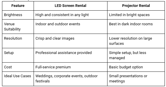 Compare LED screen and projector rentals to find the solution that delivers the best clarity, size, and impact for your audience.